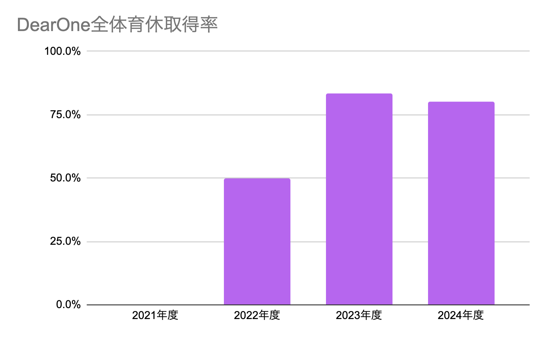 DearOneの育児休業取得率は、多様なメンバーが参画するにつれ段階的に増加し、2023年度・2024年度はなんと80%を超えました。
